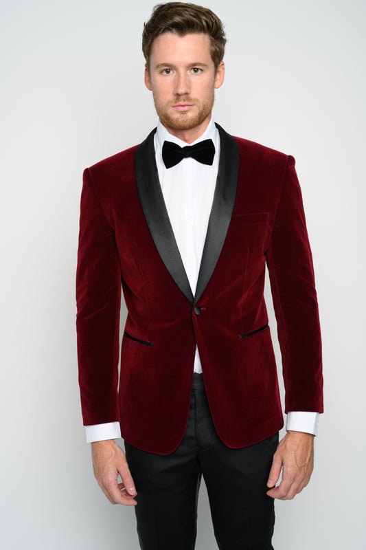 OMC Signature Men's Velvet Shawl Lapel Slim Fit Tuxedo Jacket (Burgundy)