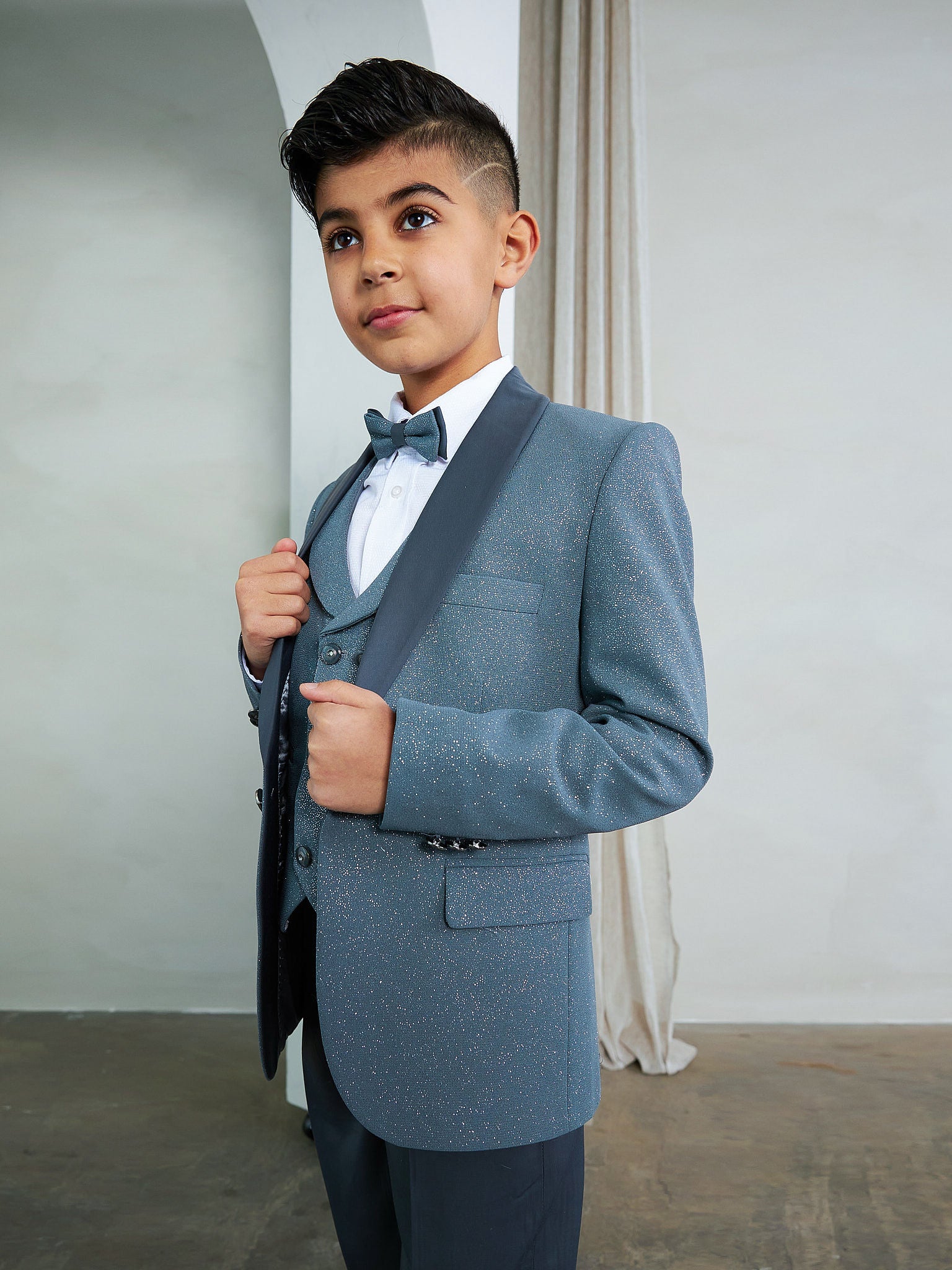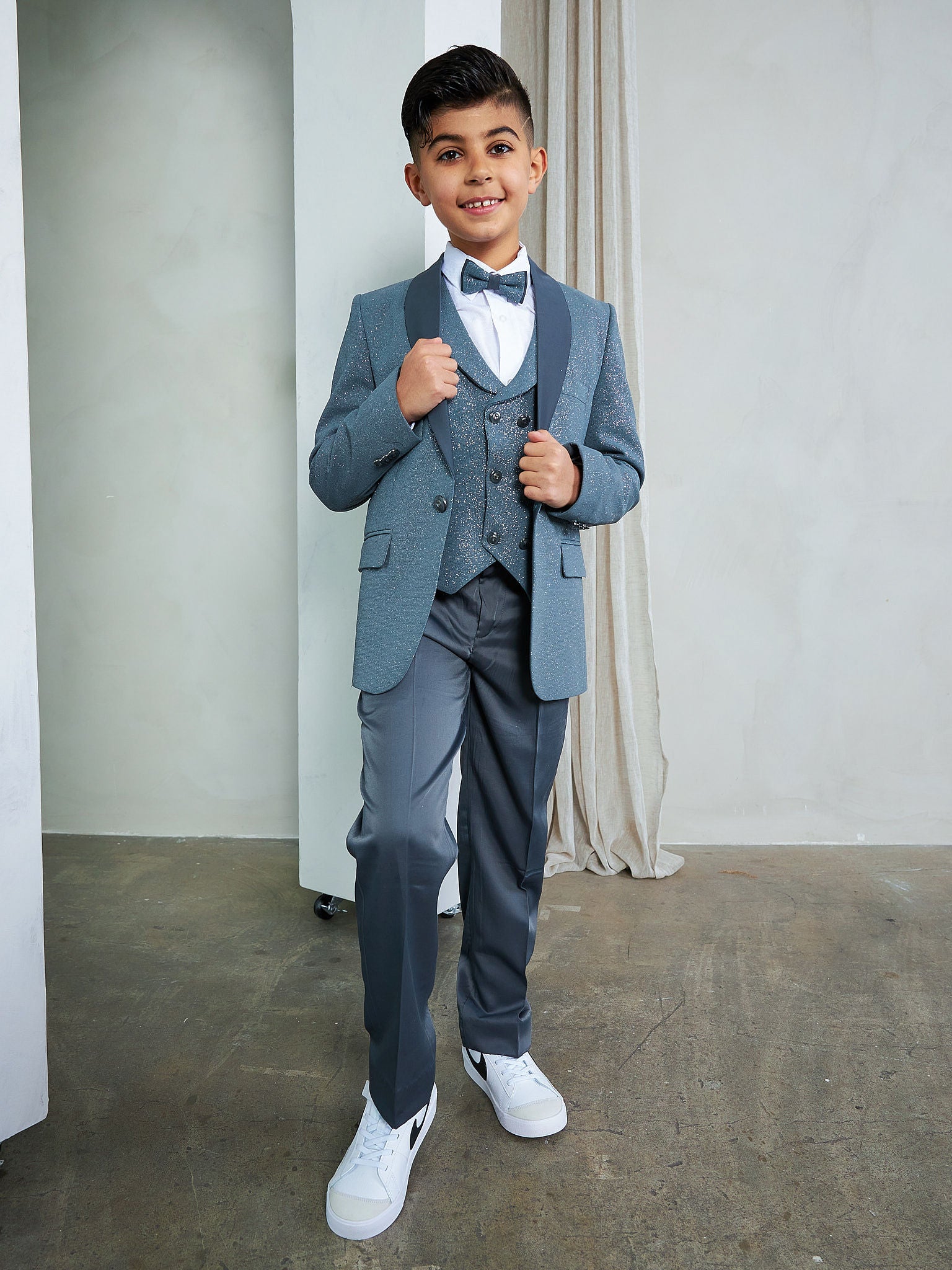 Boy's 5-Piece Modern Sequin Tuxedo Set consists of a high quality jacket, a double breasted vest, dress shirt and pants set.