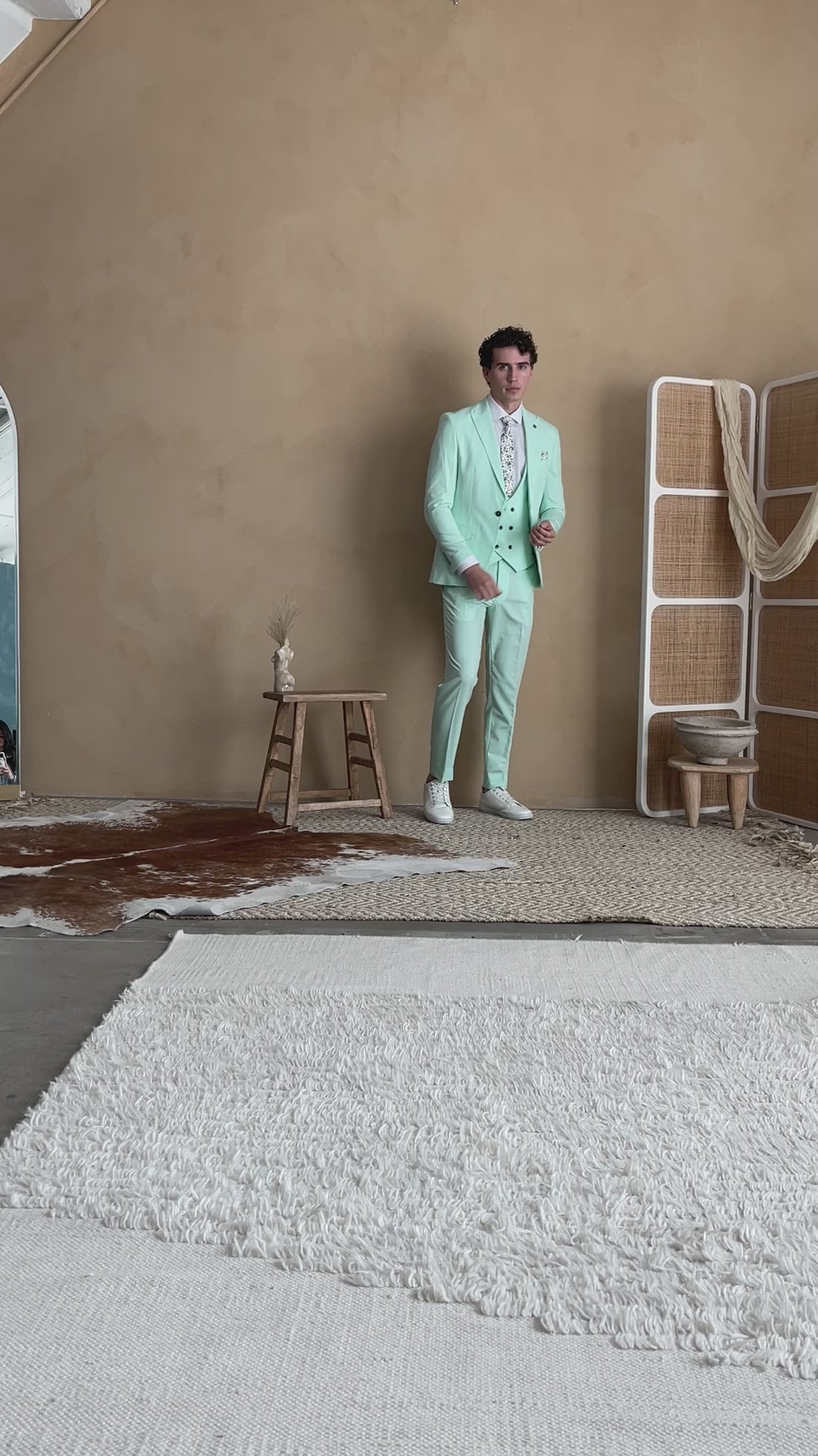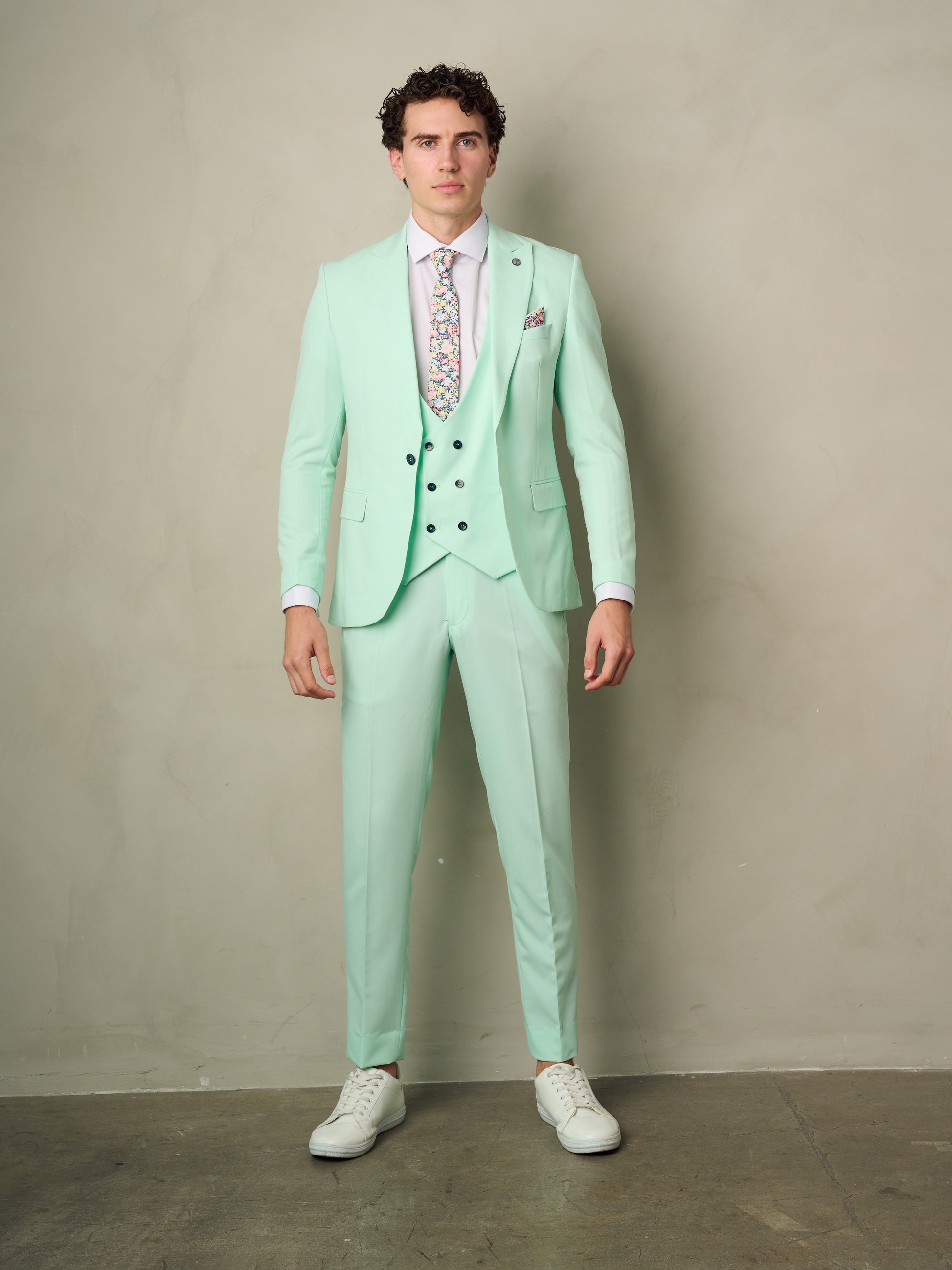 - Men's 3-Pieces Slim Fit Mint Green Suit consists of a high quality jacket, double breasted vest and pants