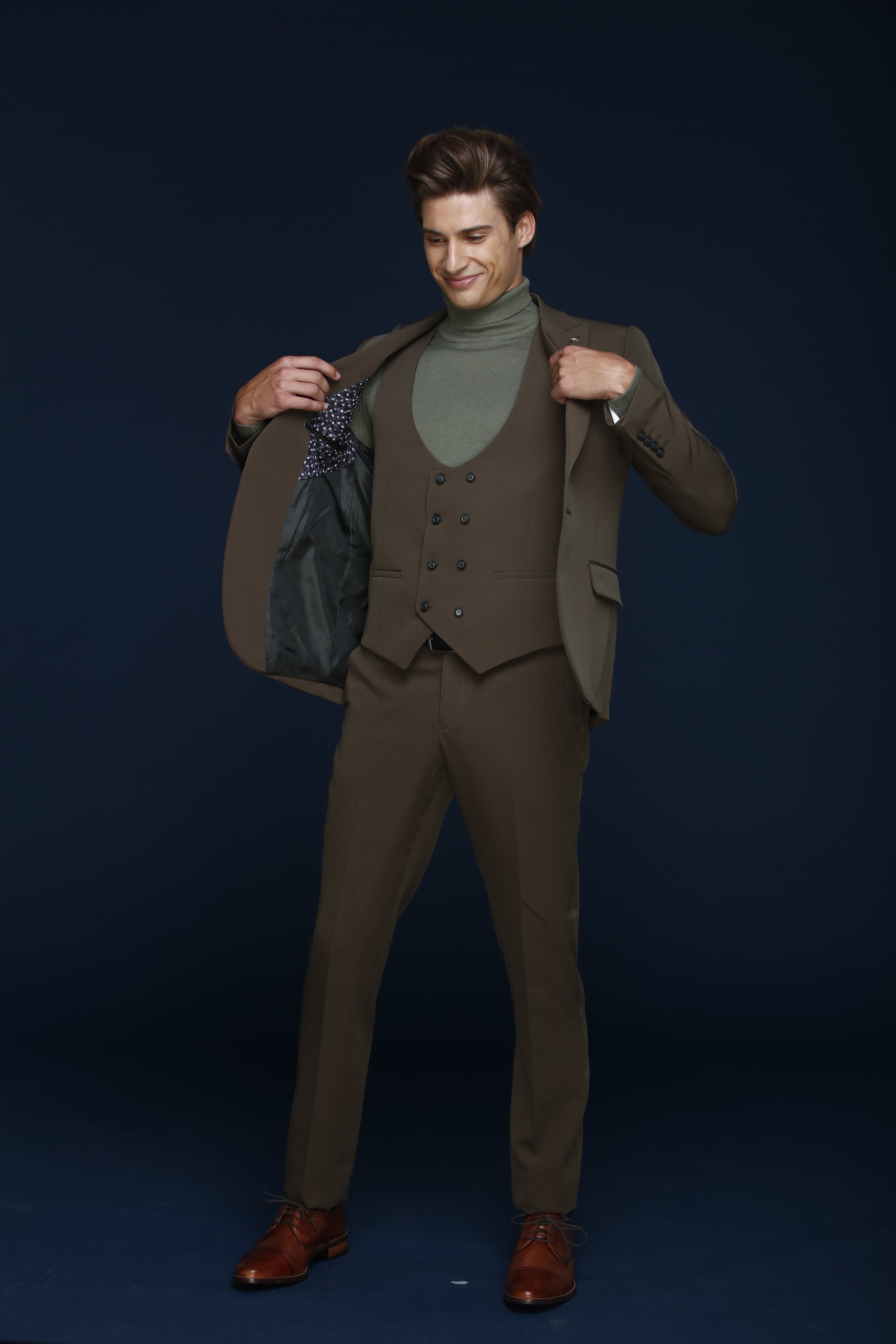 Our Men's 3-Pieces Peak Lapel Olive Color Suit dappers you right up!