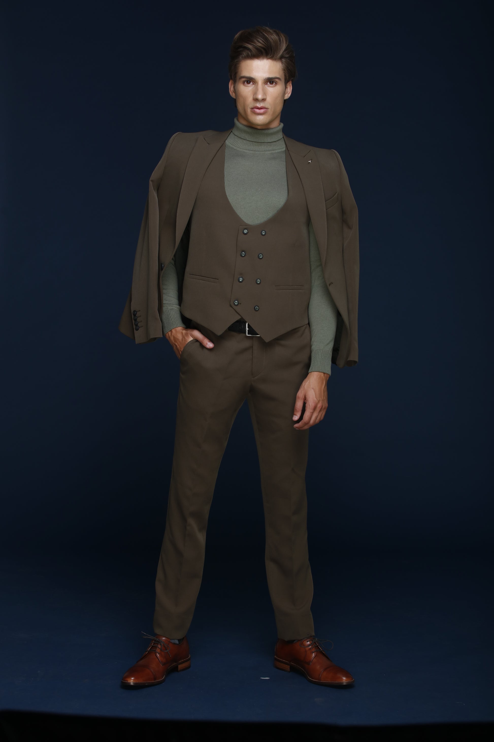 Men's 3-Pieces Peak Lapel Olive Color Suit consists of Jacket, Double Breasted Vest and Pants only