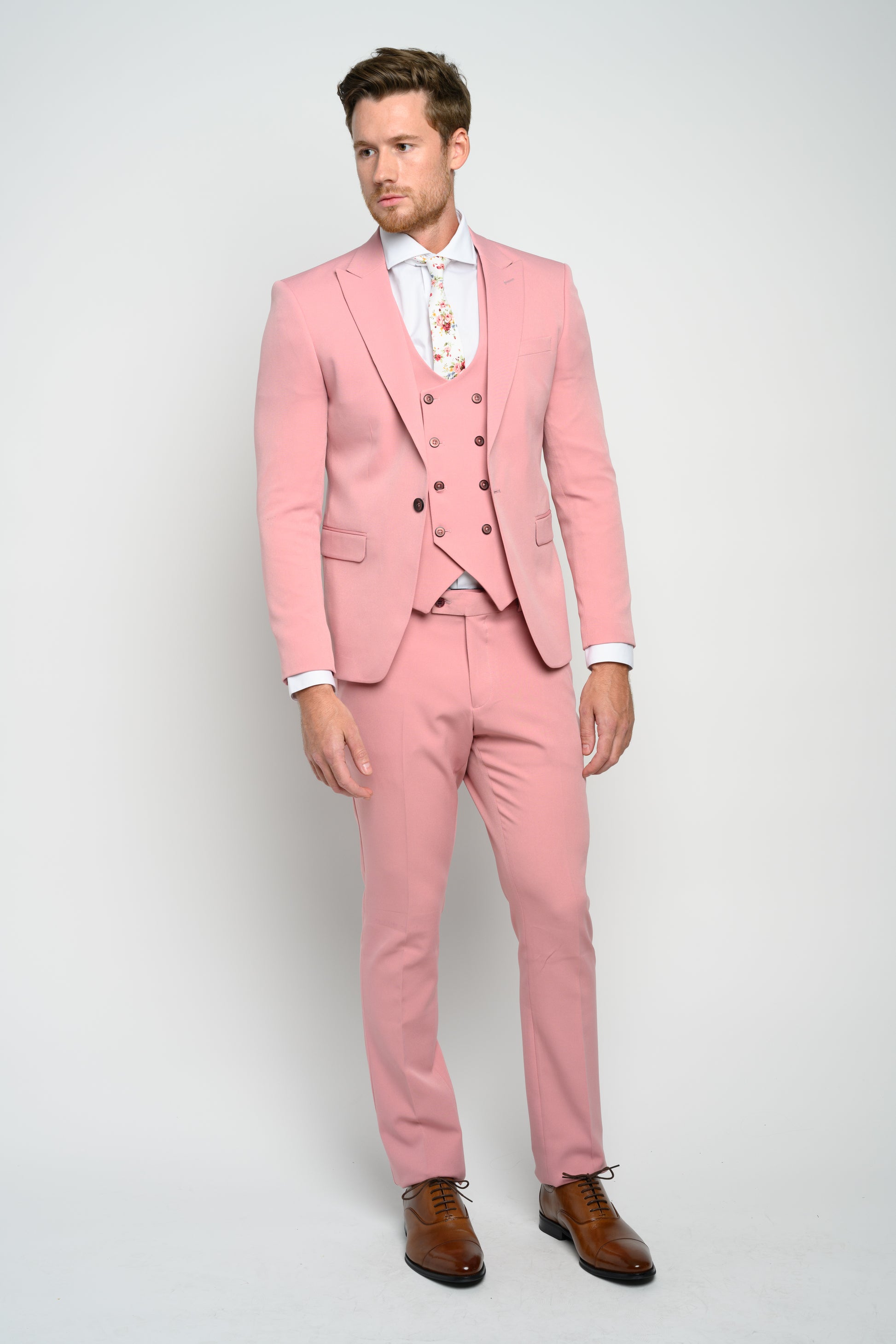 Men's 3-Pieces Peak Lapel Pink Color Suit consists of Jacket, Double Breasted Vest and Pants only