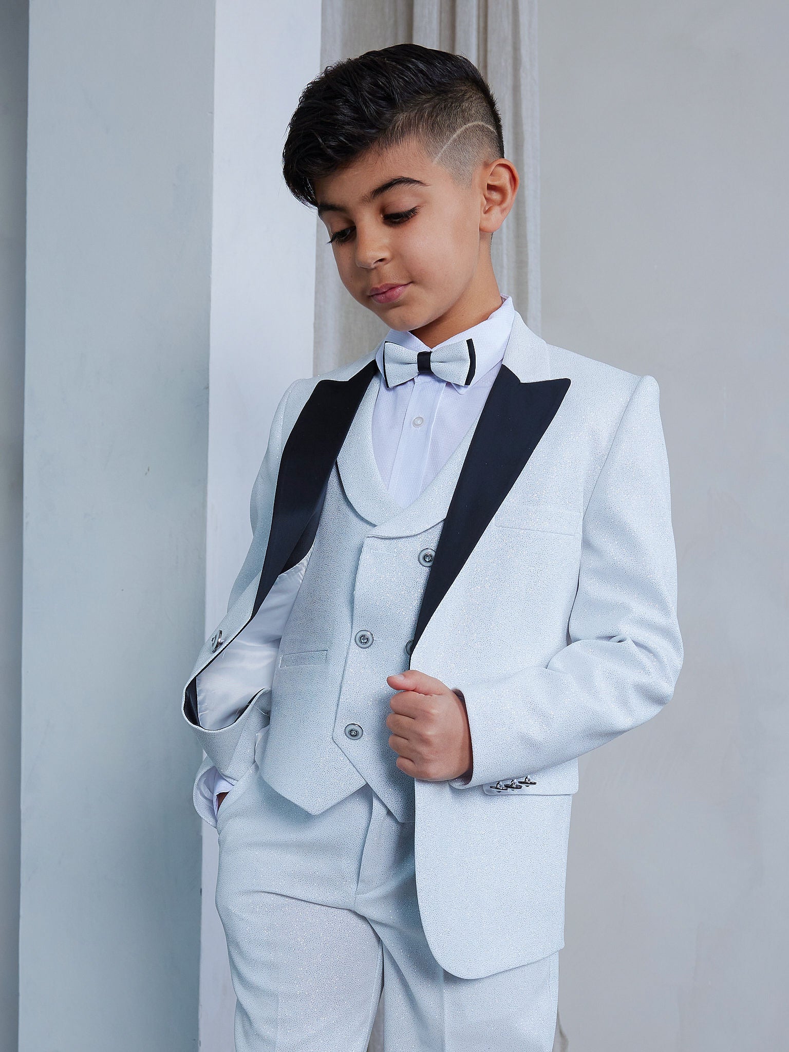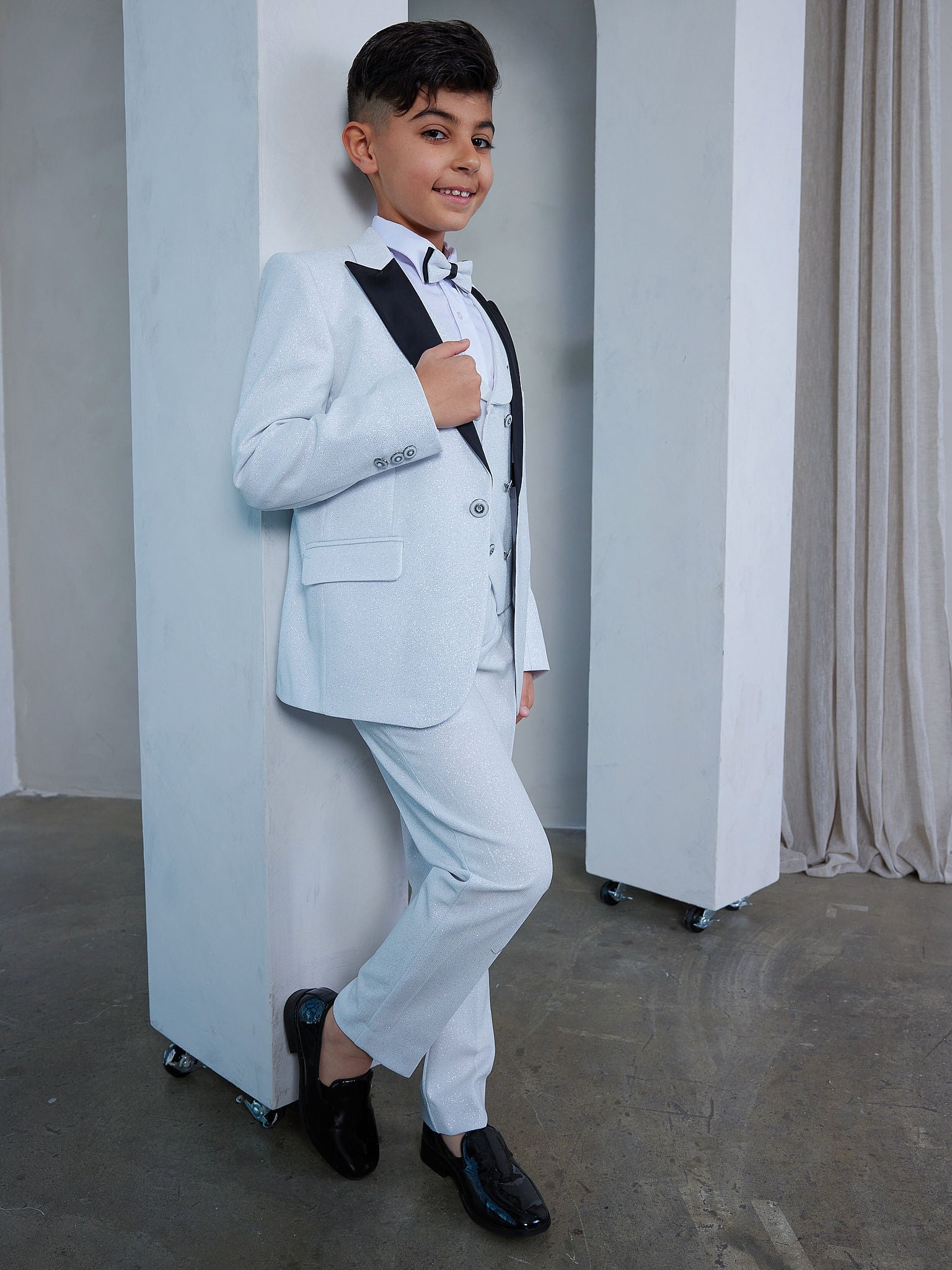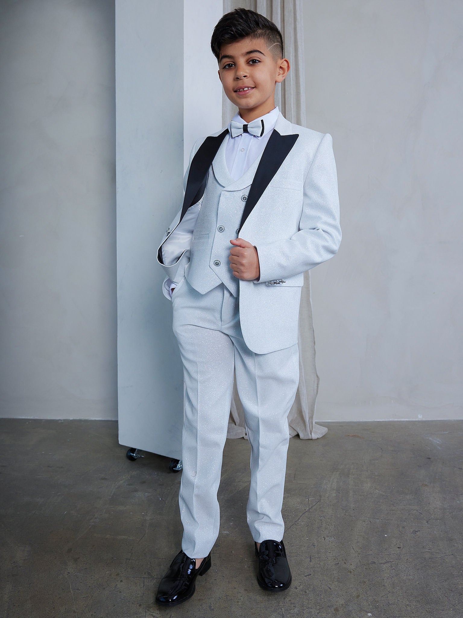 Boy's 3-Piece Modern Sequin Tuxedo Set consists of a high quality jacket, a double breasted vest, dress shirt and matching white pants set.